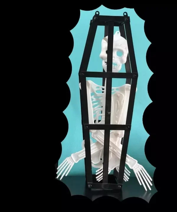 adorno esqueleto con ataud (quedan extremidades afuera)