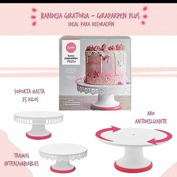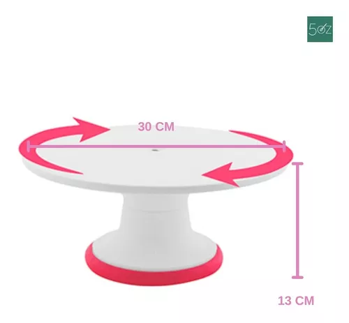 Bandeja Plástica Giratoria de 30 cm de diámetro x 15 cm de alto.Especial para decorar tus tortas con facilidad y luego exhibirlas con sus diferentes guardas decorativas.Su aro antideslizante permite que la base quede firme y se pueda decorar con mayor agilidad.Soporta hasta 20 Kg.